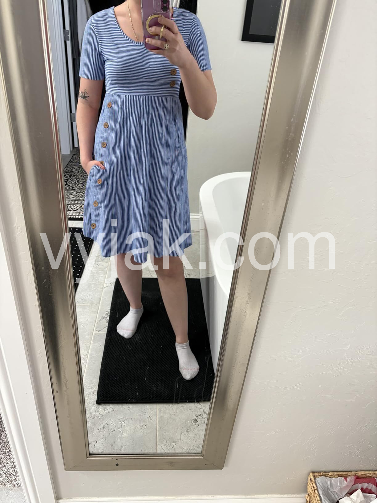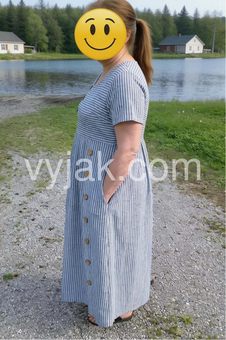 I really like the medium-weight fabric used to make this dress. Not only is it soft and comfortable against the skin, but it is also thick enough to create a nice flowing drape in the skirt that sets it apart from regular “T-shirt Dresses“. It is well-constructed with tight, even seams that are surged, and the prints are gorgeous and true to the photos included in the item description. It even has deep pockets on both sides, which is always a plus! The length meets with my approval—below the knee but not too long. I’m 5’6”, 180lbs for reference. I found the size chart to be accurate and ordered an XL. It fits nicely.