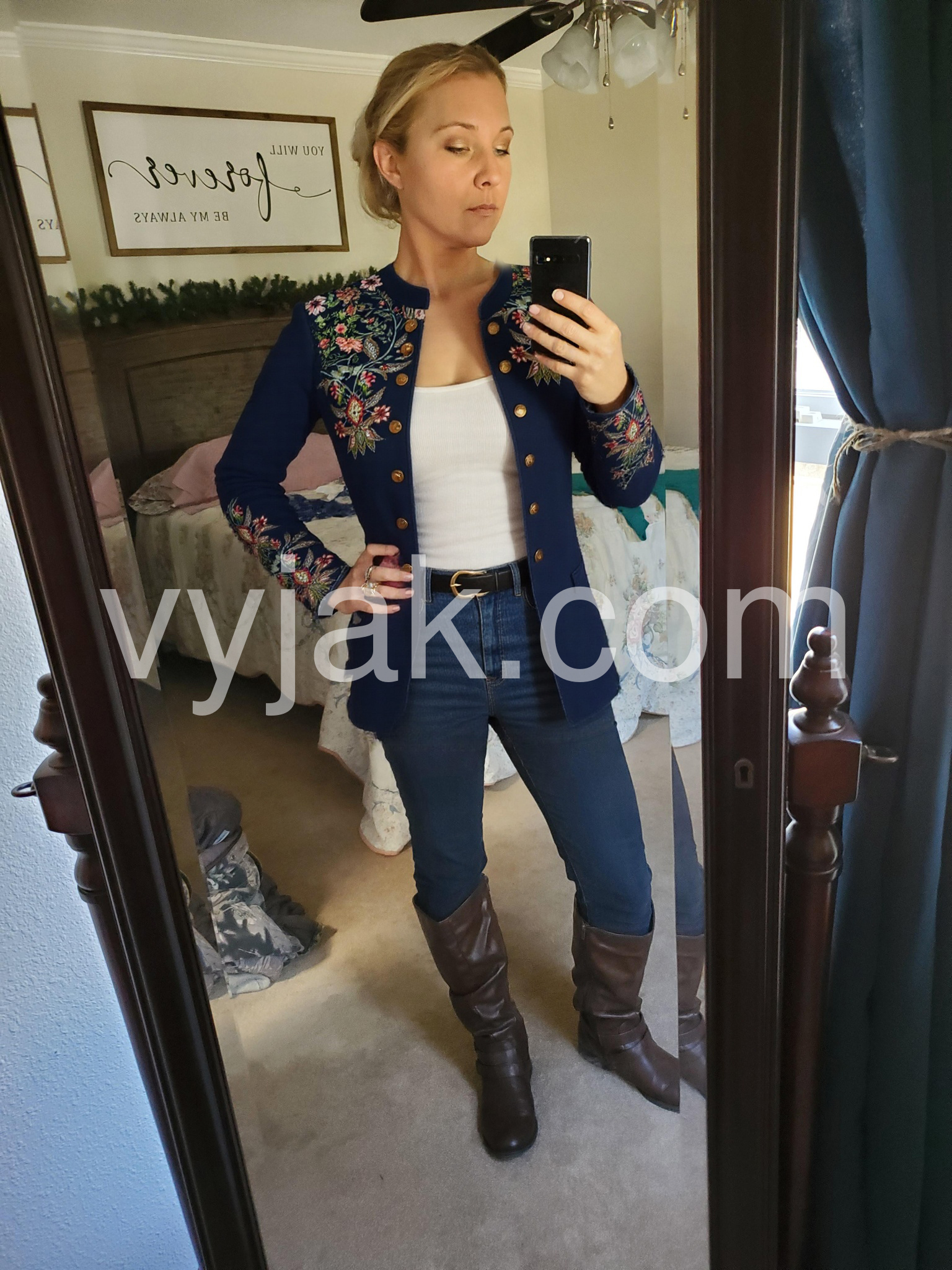 I love this jacket! The navy blue color with the intricate floral embroidery is so elegant and unique.
