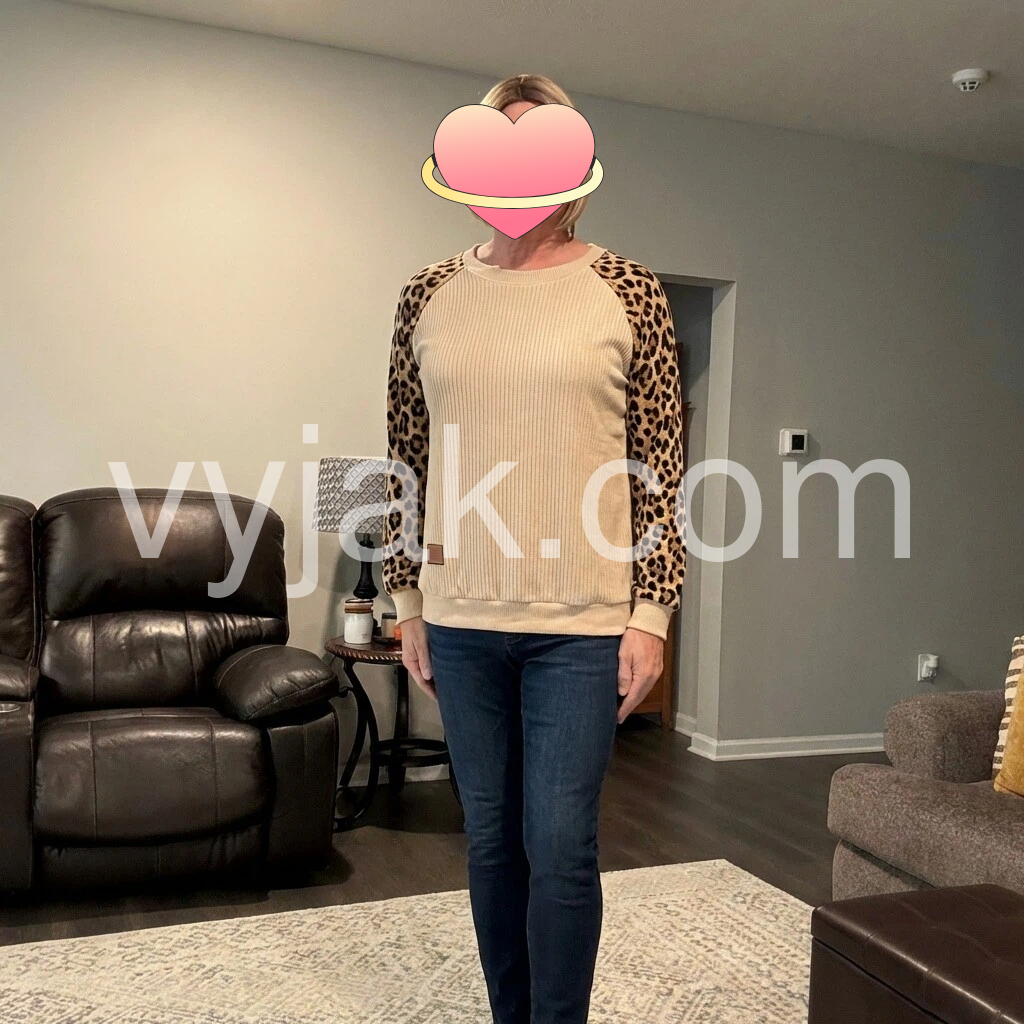 I really love this top! The beige knit is soft and comfortable, and the leopard print sleeves add a fun, stylish touch. The fit is flattering and the fabric feels well made. It’s great for fall layering and looks just like the photos.