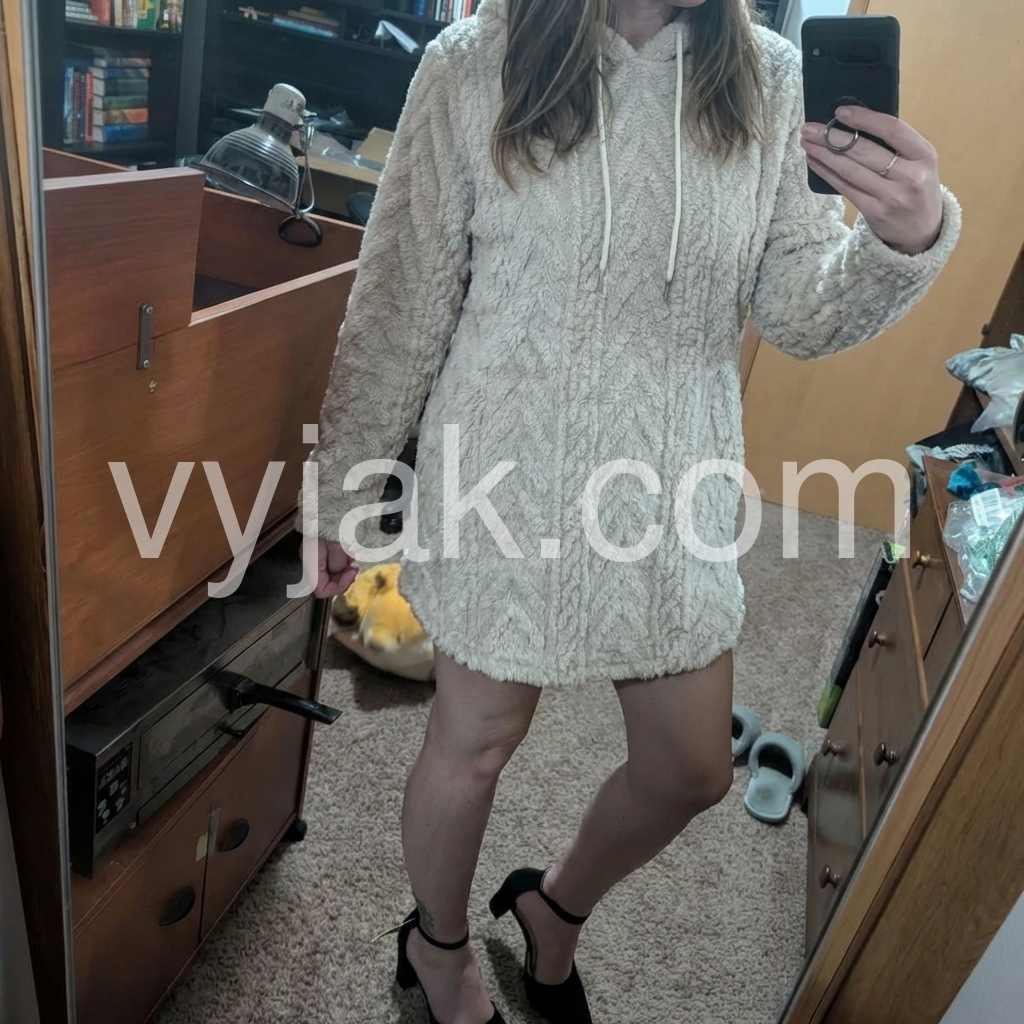 This fuzzy hooded tunic is a winter game-changer! The plush, thick fabric feels like wearing a cloud—so warm and cozy for cold mornings. The chevron pattern adds a cute texture, and the drawstring hood keeps the wind out. It’s long enough to cover my hips, pairing perfectly with leggings. The quality is amazing for the price!