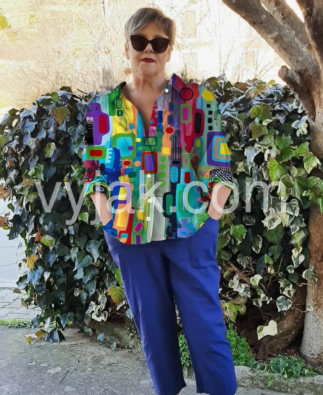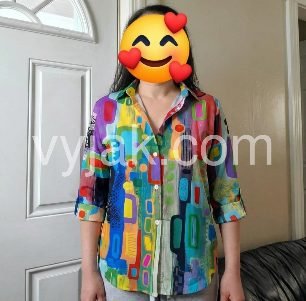I love this top.I’m loving the colorful geometric design on this blouse. It’s the perfect way to add a stylish, modern touch to my wardrobe.