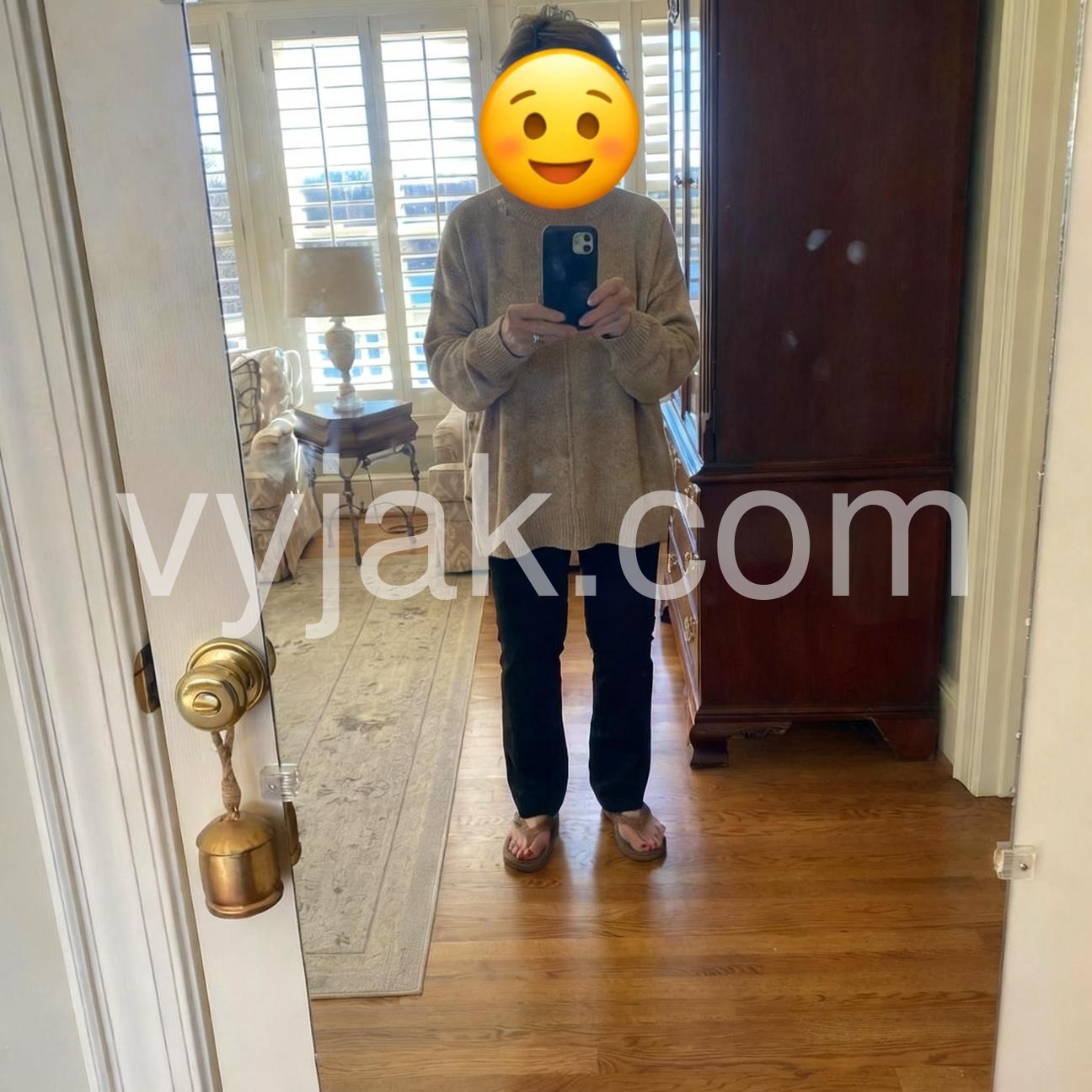 Nice longish sweater! Soft and TTS! The length and width are forgiving and not form fitting. The sweater falls to the hip bone.