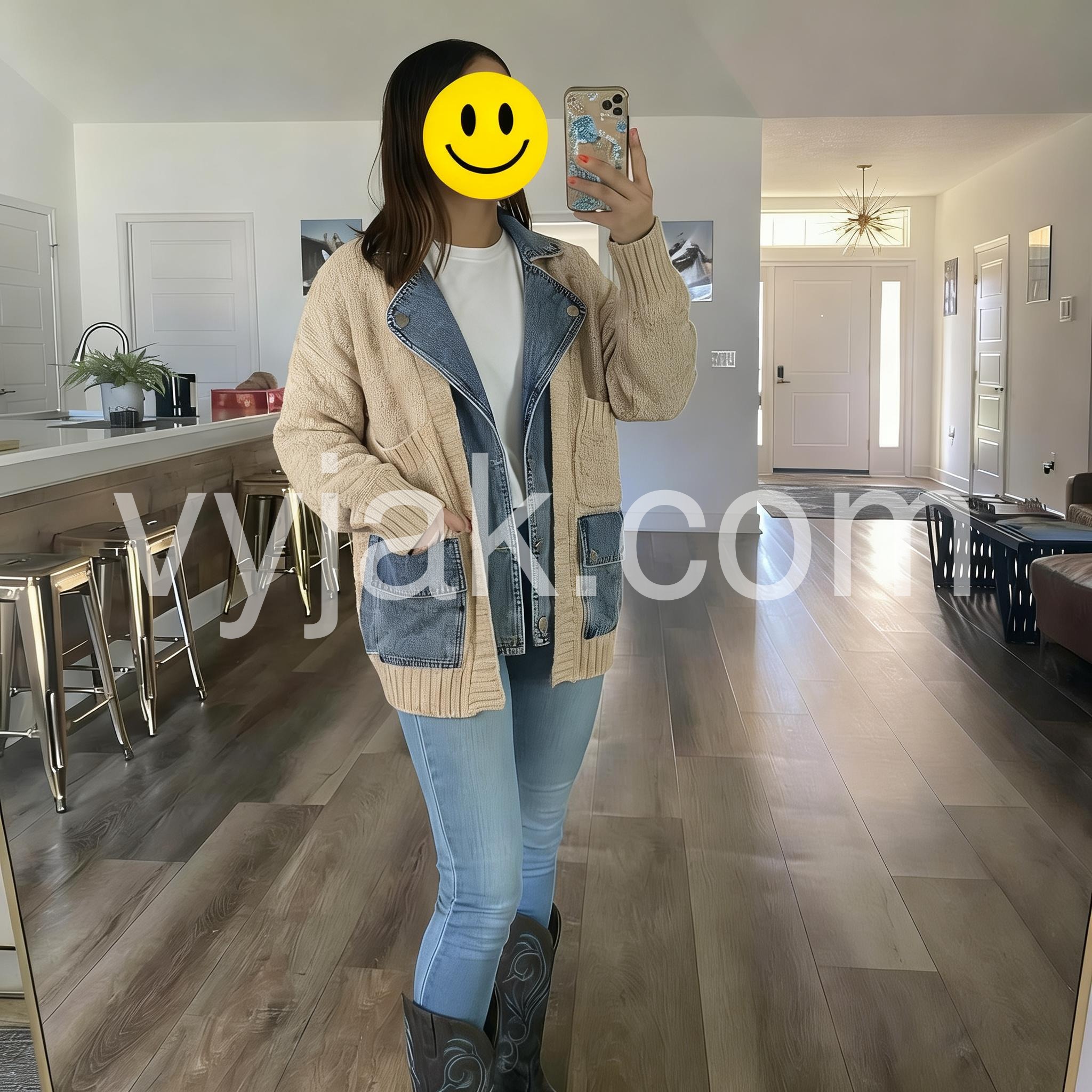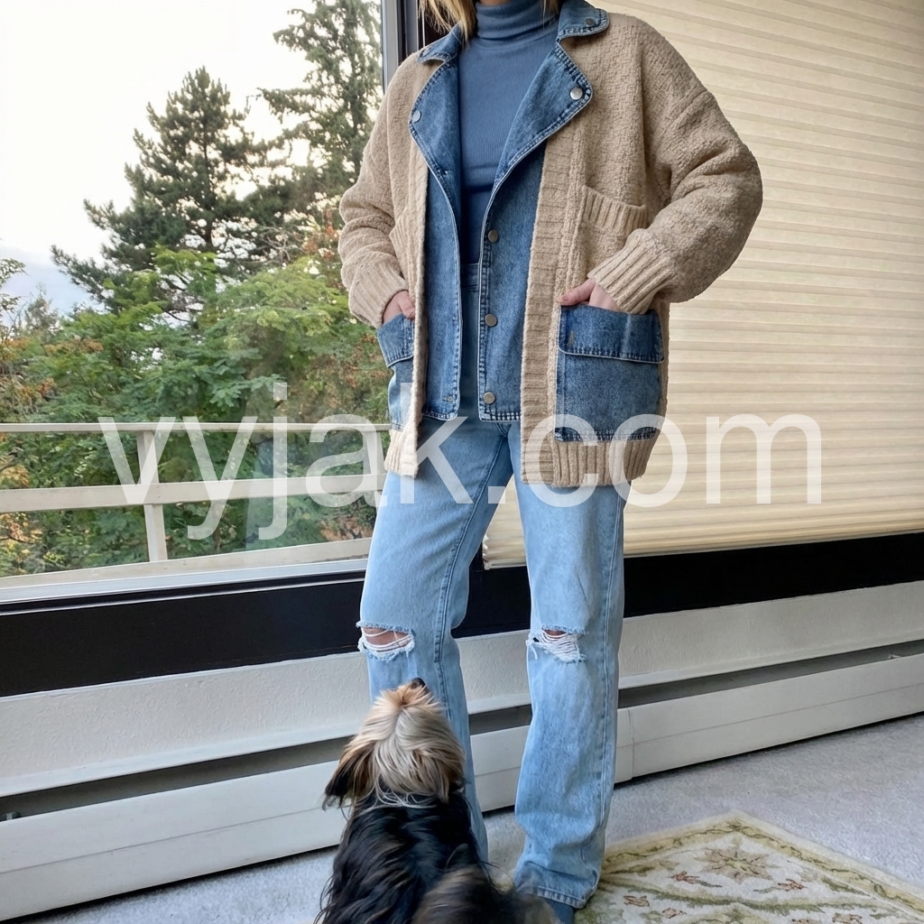 This jacket is a fun addition to my wardrobe! The look is unique with the combination of sweater and demin. The jacket is quite warm and perfect for throwing over a T-shirt and walking the dog on cool days. It is casual, but would also be fine for running to the store or grabbing coffee with a friend. Could be dressed up a little bit with a blouse underneath and a boho necklace. Whenever I put this on, I feel warm and cozy. That's the best part!