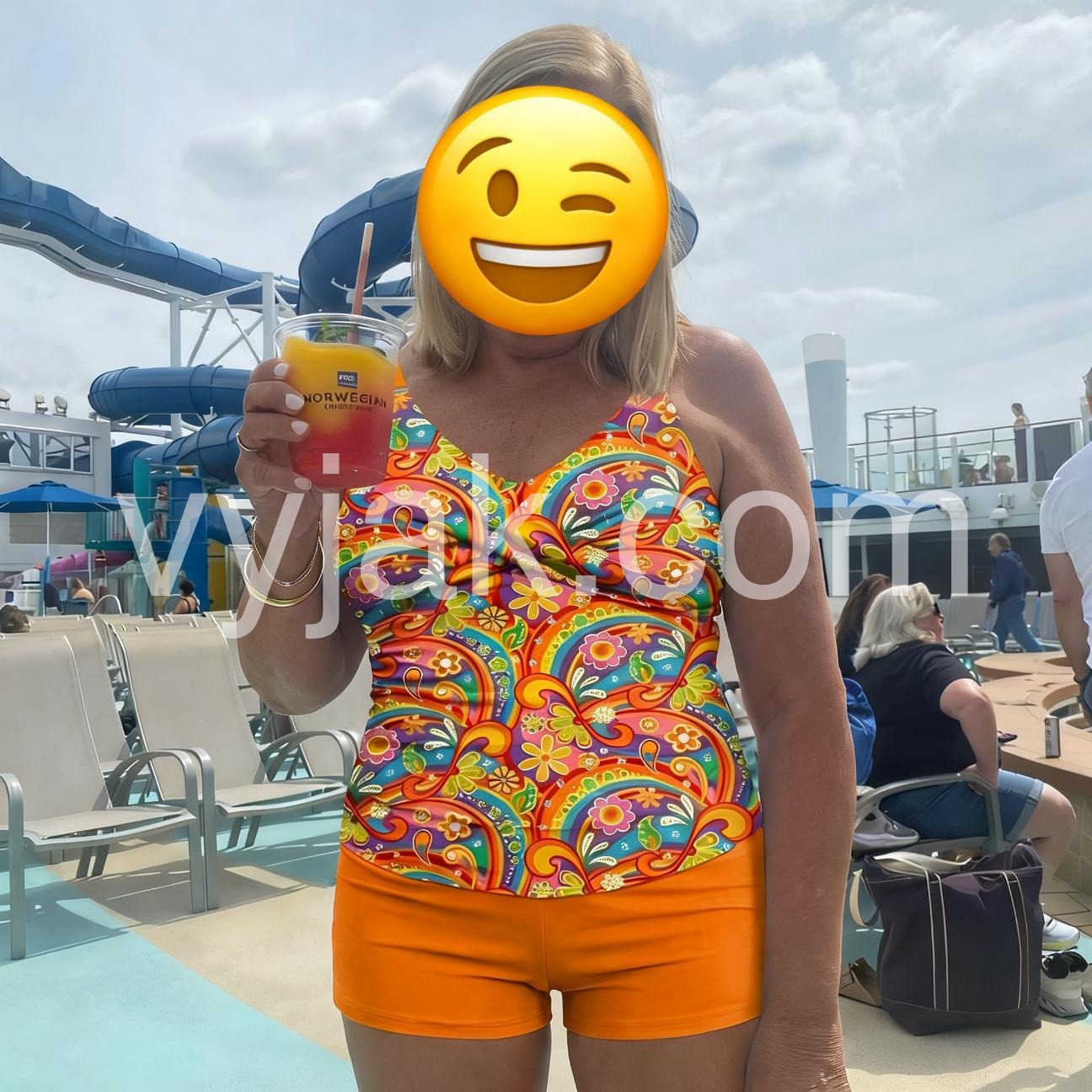 This swimsuit is beautiful and exactly as pictured, the suit design is awesome and really helps hold in and hide a belly, and is very comfortable. And at first I got tons of compliments. Fits true to size.