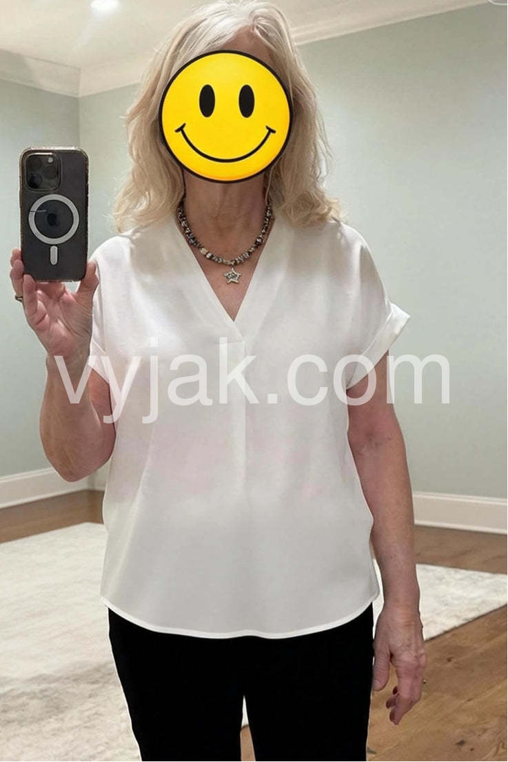 This shirt is so amazingly cute, travels well and can be tucked in or not !! I’ve gotten lots of compliments. The V-neck and short sleeves are flattering and feminine, and the fabric feels comfortable and breathable. Perfect for dressing up or casual wear. Highly recommend!