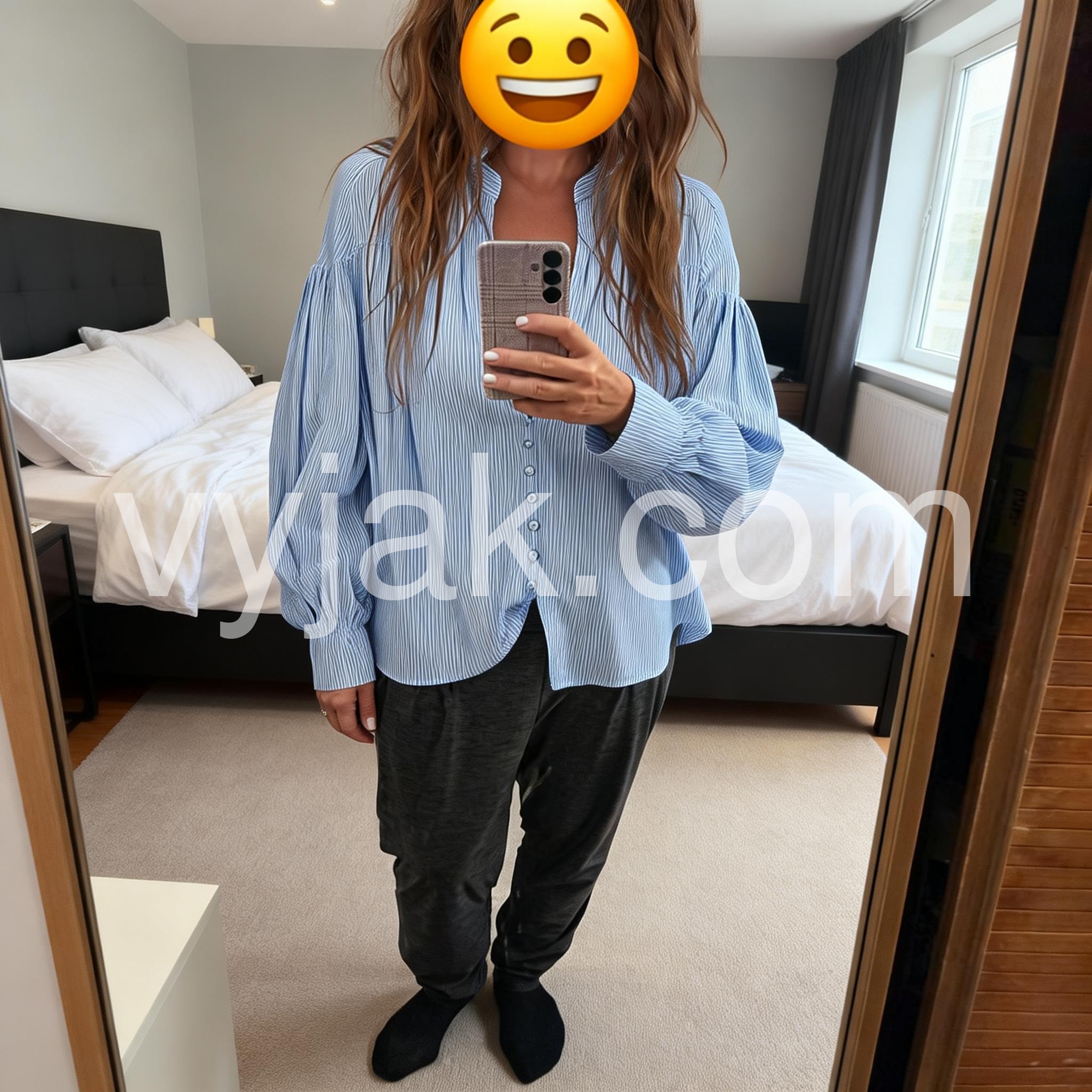 Absolutely love this top! The light blue stripes give it such a classic coastal vibe. The lantern sleeves are dramatic but still manageable for everyday wear. The fabric is super lightweight and breathable, making it perfect for spring and summer. Highly recommend!